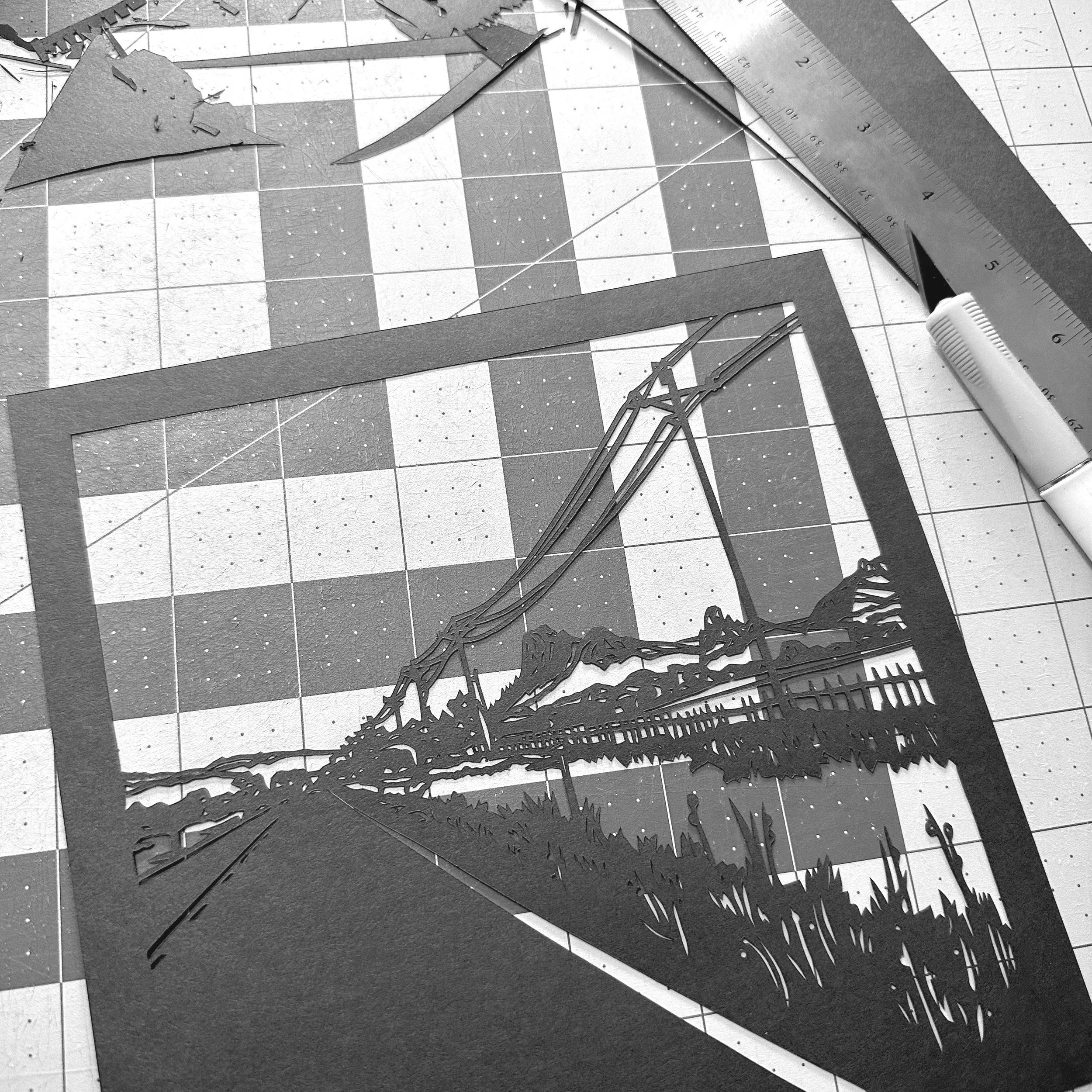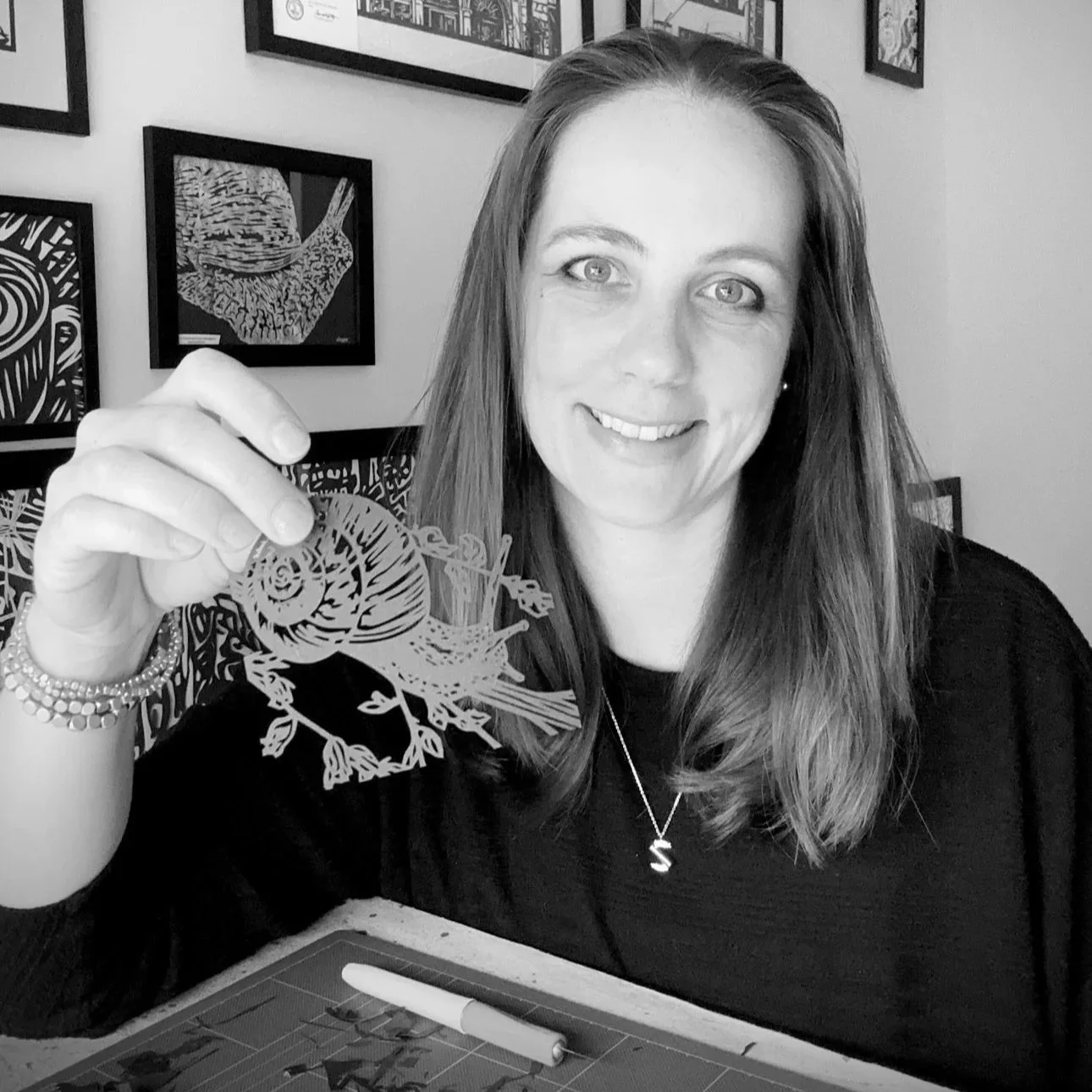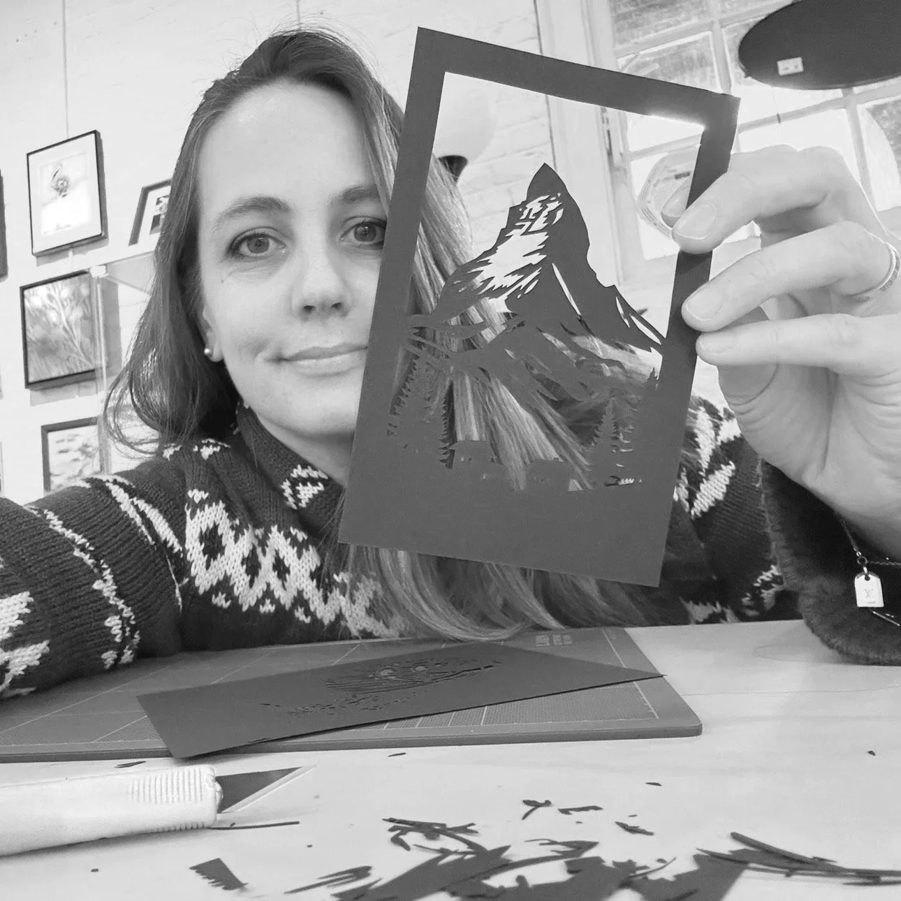 Her original and limited edition works are held in private collections from Brazil to Germany, and can be found at the Workhouse Arts Center, Bunnyman Brewery, and various art fairs and events including at the Swiss Embassy. She also loves to share her craft through papercutting workshops. Her ultimate goal remains simple: to create work that invites connection, encourages reflection, and makes room to laugh at the absurdity of it all.